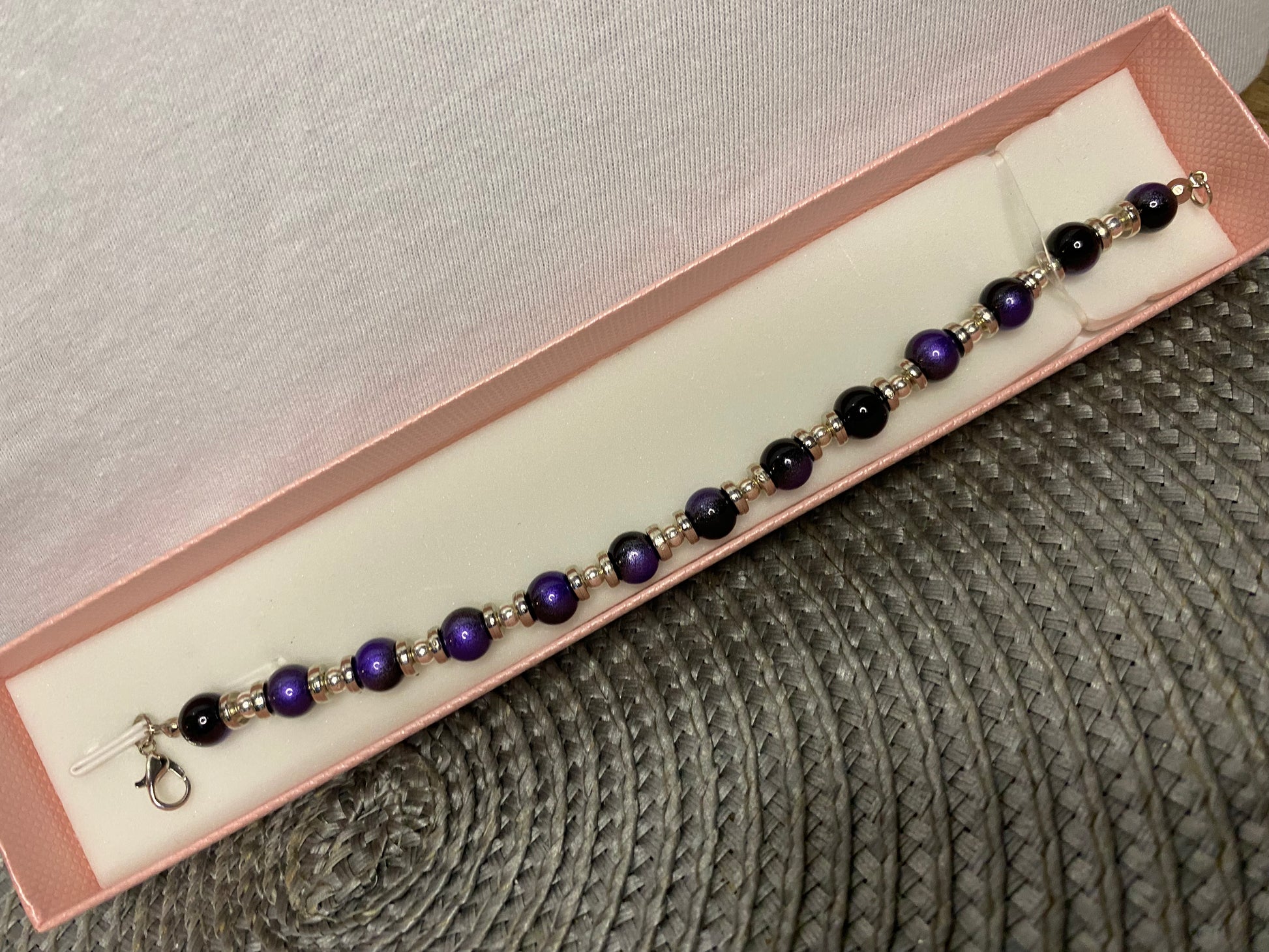 Velice elegantní lesklý černo fialový skleněný korálek doplněný o stříbrné prvky. Vhodný jako doplněk na galavečery, plesy apod.