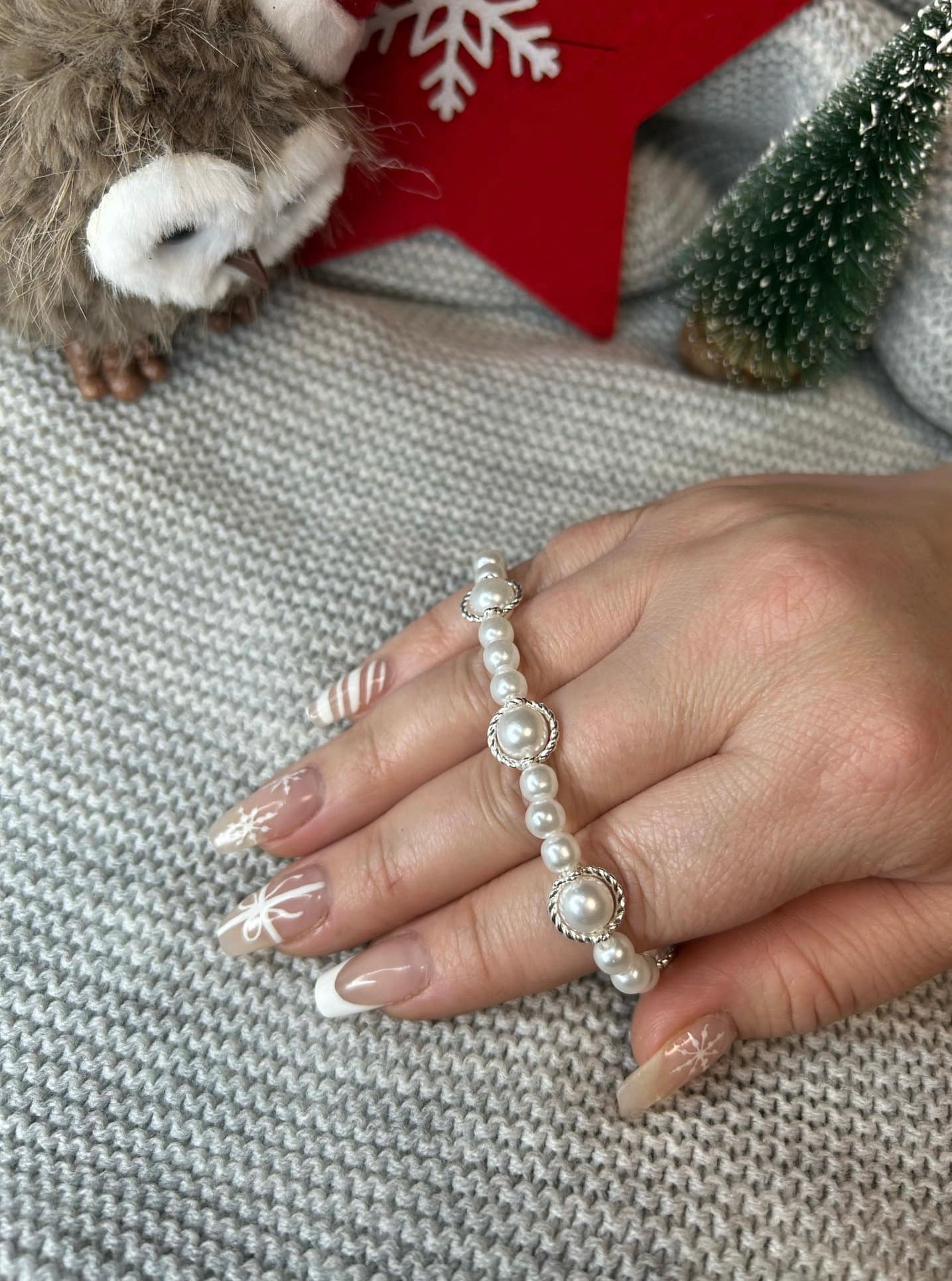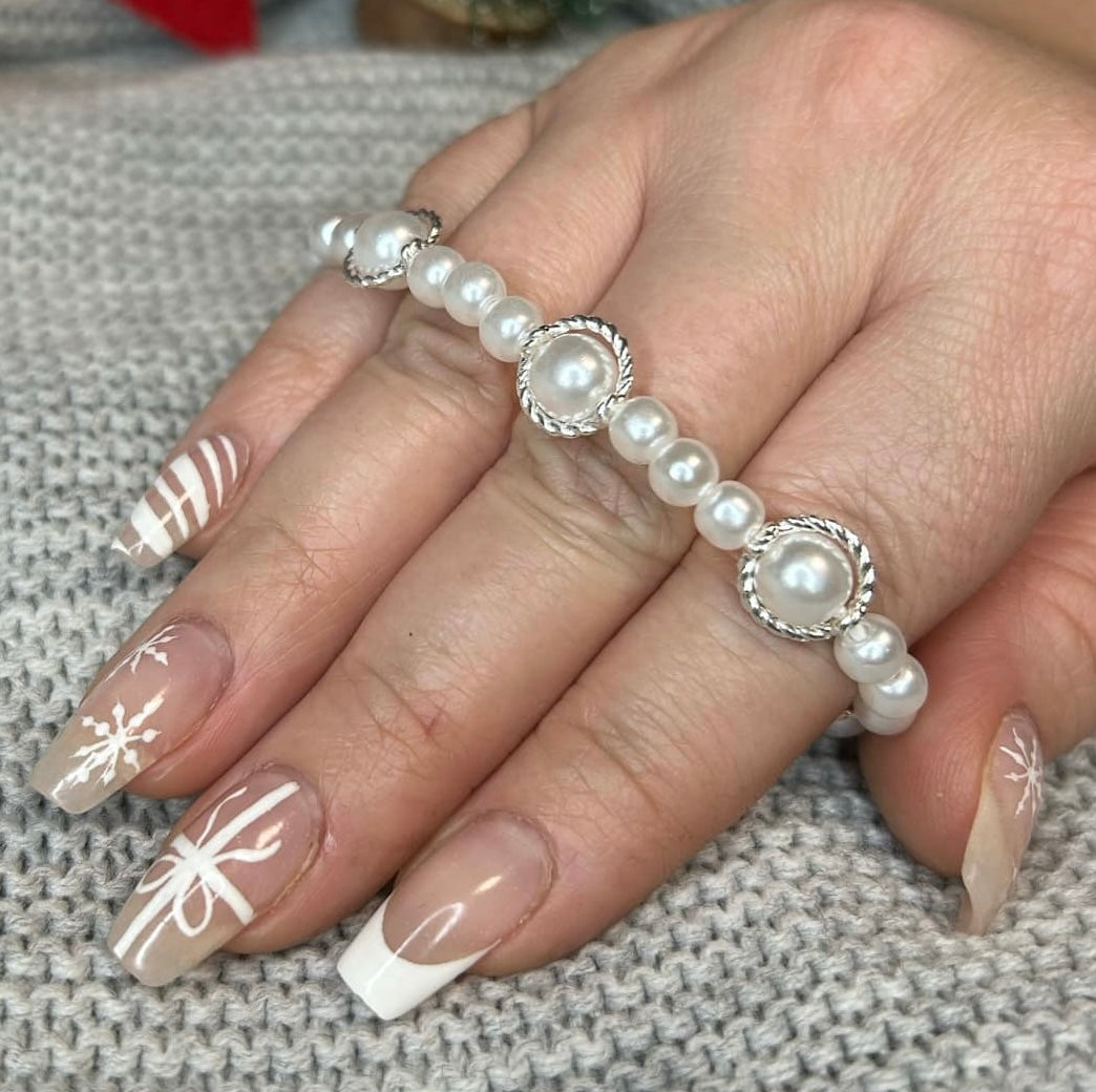Velmi elegantní perlový náramek doplněný o prstencový vzor. Zapínání bílé s karabinkou.